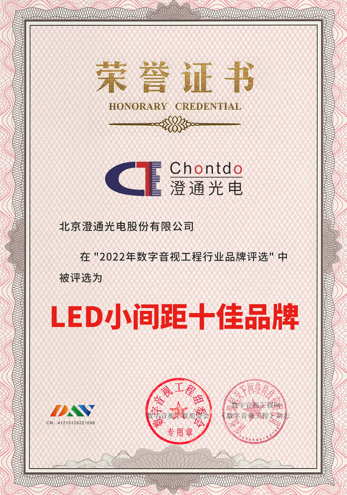 北京澄通光电股份有限公司在“2022年数字因视工程行业品牌评选”中,被评选为:LED小间距十佳品牌